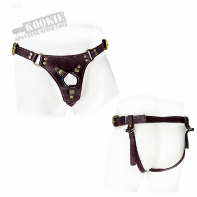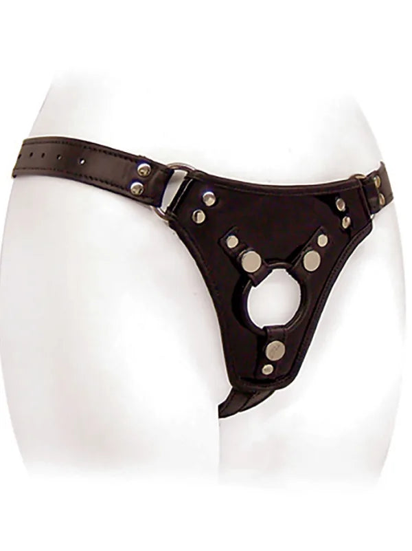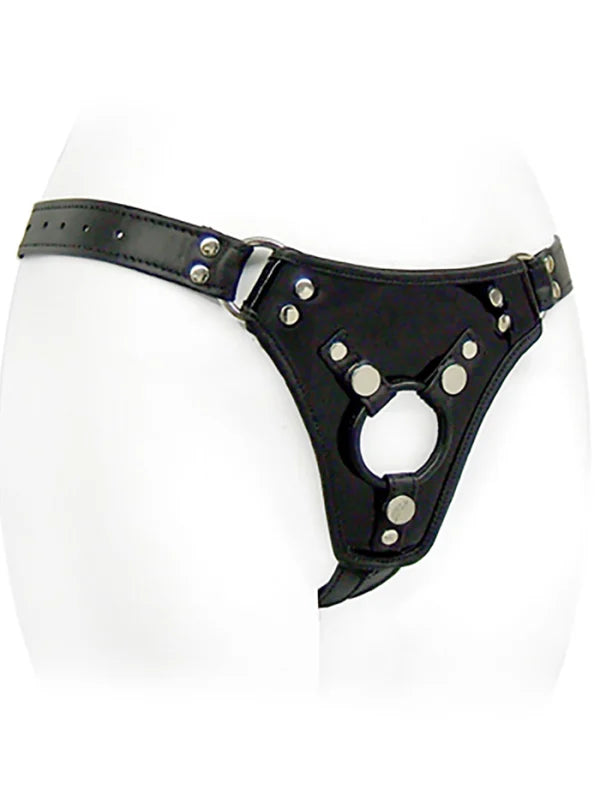 This sexy jock-style harness rests lower on the wearer's hips than other designs, allowing the dildo placement to be lower on the body during intimate play. Handmade with soft leather, comfortable, and functional, the Low Rider is a versatile and customizable harness. It features a buckling adjustable waist (fitting 30” to 44”) and two D-ring adjustable straps for in-the-moment tightening. Connecting the front pad to the waist strap around each thigh, they can also can be slid into the perfect fit on the backstrap. With a driver pad featuring a stitched hole for a dildo, plus a removable O-ring that can be swapped out for a different size to help keep your dildo secure. Made in the USA.